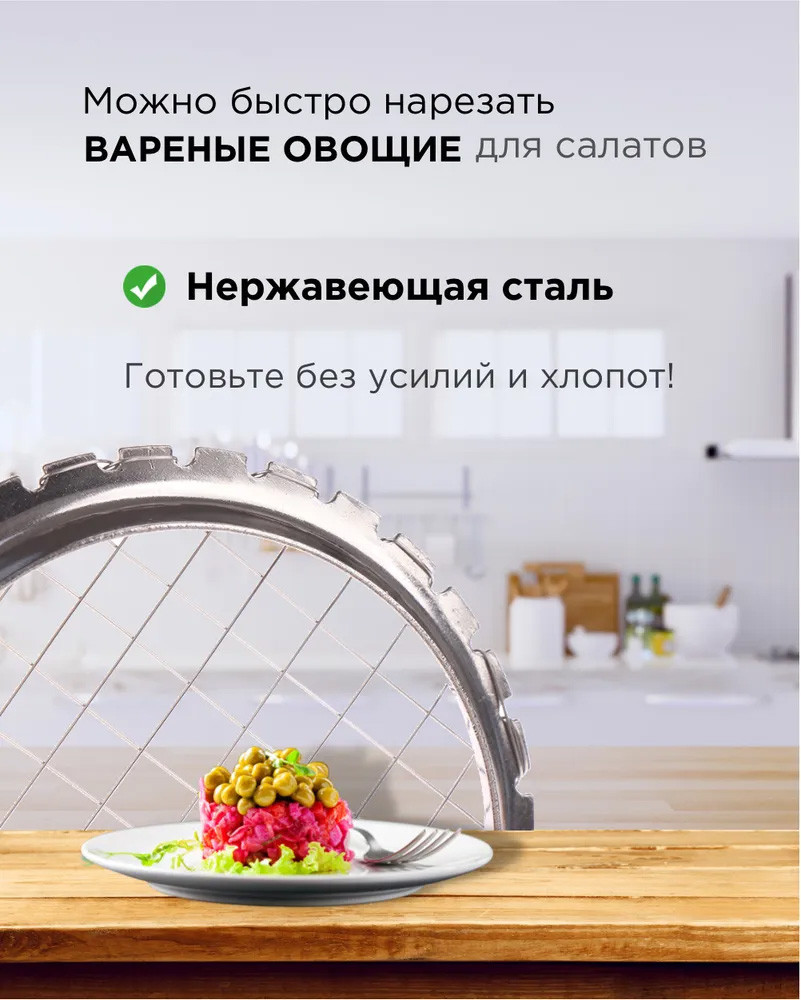 Ця яйцерізка швидко подрібнить яйця і варені овочі на олів'є, вінегрет та інші салати. Також вона ріже на кубики ковбасу, сир, крабові палички, фрукти (банани, ківі та ін). Має відмінну натяжку дротяної сітки.